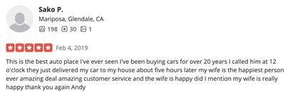 This is the best auto place I've ever seen I've been buying cars for over 20 years I called him at 12 o'clock they just delivered my car to my house about five hours later my wife is the happiest person ever amazing deal amazing customer service and the wife is happy did I mention my wife is really happy thank you again Andy