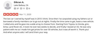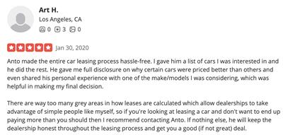 Anto made the entire car leasing process hassle-free. I gave him a list of cars I was interested in and he did the rest. He gave me full disclosure on why certain cars were priced better than others and even shared his personal experience with one of the make/models I was considering, which was helpful in making my final decision. There are way too many grey areas in how leases are calculated which allow dealerships to take advantage of simple people like myself, so if you're looking at leasing a car and don't want to end up paying more than you should then I recommend contacting Anto. If nothing else, he will keep the dealership honest throughout the leasing process and get you a good (if not great) deal.
