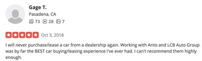 I will never purchase/lease a car from a dealership again. Working with Anto and LCB Auto Group was by far the BEST car buying/leasing experience I've ever had. I can't recommend them highly enough.