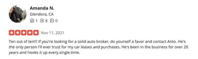 Ten out of ten!!! If you're looking for a solid auto broker, do yourself a favor and contact Anto. He's the only person I'll ever trust for my car leases and purchases. He's been in the business for over 20 years and hooks it up every.single.time.