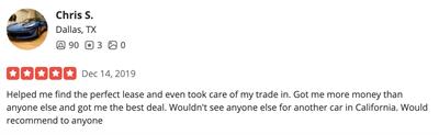 Helped me find the perfect lease and even took care of my trade in. Got me more money than anyone else and got me the best deal. Wouldn't see anyone else for another car in California. Would recommend to anyone