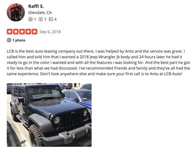 LCB is the best auto leasing company out there. I was helped by Anto and the service was great. I called him and told him that i wanted a 2018 Jeep Wrangler Jk body and 24 hours later he had it ready to go in the color i wanted and with all the features i was looking for. And the best part he got it for less than what we had discussed. I've recommended friends and family and they've all had the same experience. Don't look anywhere else and make sure your first call is to Anto at LCB Auto!