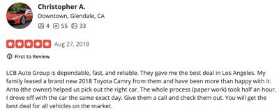 LCB Auto Group is dependable, fast, and reliable. They gave me the best deal in Los Angeles. My family leased a brand new 2018 Toyota Camry from them and have been more than happy with it. Anto (the owner) helped us pick out the right car. The whole process (paper work) took half an hour. I drove off with the car the same exact day. Give them a call and check them out. You will get the best deal for all vehicles on the market.